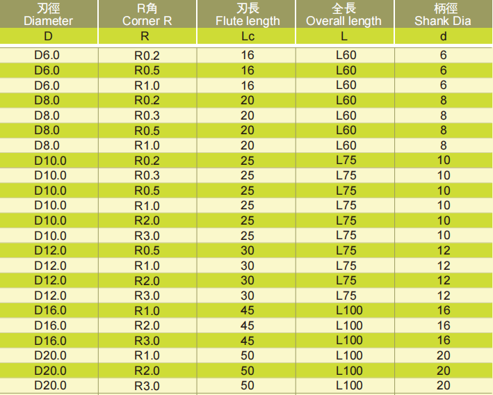 极超微粒长柄圆头铣刀HBH2FLUTES